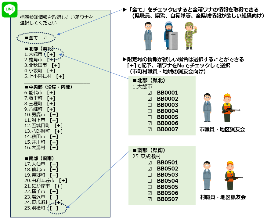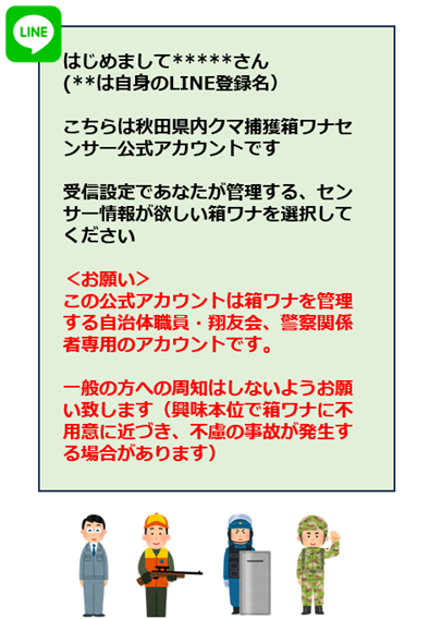※本方式は「LINEセグメント配信」と呼ばれる、ユーザーが欲しい地区や内容を選択して受信できる機能であり、アキタネットとプレイネクストラボが共同受託し運用する『秋田県公式LINEアカウント』にて、「クマダス」「気象情報」「河川情報」等との外部システムと連携している実績のある技術です。
